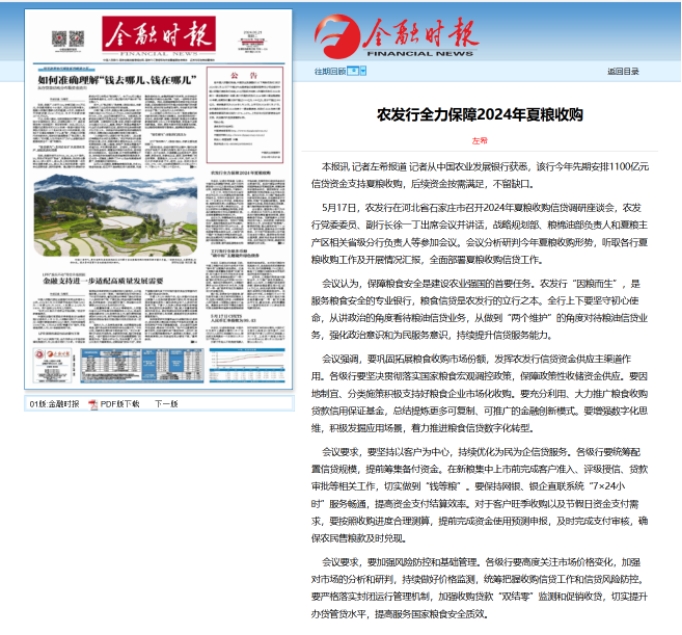 5月17日,農(nóng)發(fā)行在河北省石家莊市召開2024年夏糧收購信貸調(diào)研座談會,農(nóng)發(fā)行黨委委員、副行長徐一丁出席會議并講話,戰(zhàn)略規(guī)劃部、糧棉油部負(fù)責(zé)人和夏糧主產(chǎn)區(qū)相關(guān)省級分行負(fù)責(zé)人等參加會議。會議分析研判今年夏糧收購形勢,聽取各行夏糧收購工作及開展情況匯報(bào),全面部署夏糧收購信貸工作。